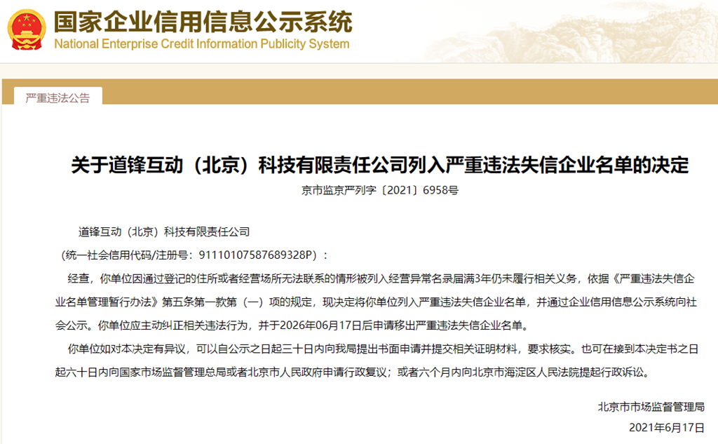 中國(guó)質(zhì)量新聞網(wǎng)訊 從國(guó)家企業(yè)信用信息公示系統(tǒng)獲悉,2021年6月17日,北京市市場(chǎng)監(jiān)督管理局發(fā)布關(guān)于道鋒互動(dòng)(北京)科技有限責(zé)任公司列入嚴(yán)重違法失信企業(yè)名單的決定(京市監(jiān)京嚴(yán)列字〔2021〕6958號(hào))。