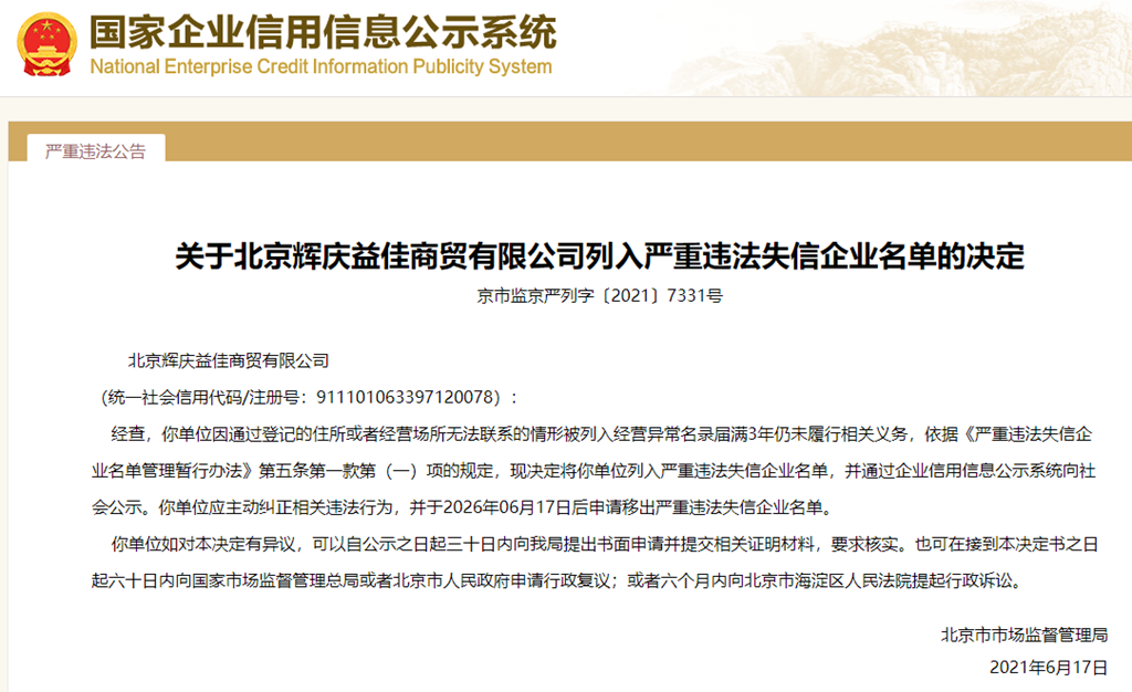 中國質量新聞網訊 從國家企業信用信息公示系統獲悉,2021年6月17日,北京市市場監督管理局發布關于北京輝慶益佳商貿有限公司列入嚴重違法失信企業名單的決定(京市監京嚴列字〔2021〕7331號)。