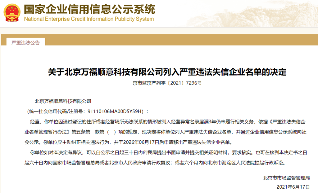中國質(zhì)量新聞網(wǎng)訊 從國家企業(yè)信用信息公示系統(tǒng)獲悉,2021年6月17日,北京市市場監(jiān)督管理局發(fā)布關(guān)于北京萬福順意科技有限公司列入嚴重違法失信企業(yè)名單的決定(京市監(jiān)京嚴列字〔2021〕7296號)。