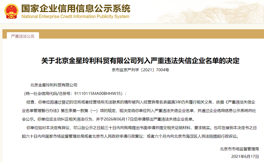 中國質(zhì)量新聞網(wǎng)訊 從國家企業(yè)信用信息公示系統(tǒng)獲悉,2021年6月17日,北京市市場監(jiān)督管理局發(fā)布關(guān)于北京金星玲利科貿(mào)有限公司列入嚴重違法失信企業(yè)名單的決定(京市監(jiān)京嚴列字〔2021〕7004號)。