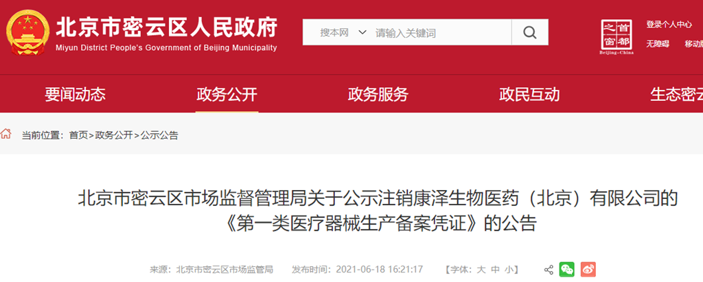 北京市密云區市場監督管理局關于公示注銷康澤生物醫藥(北京)有限公司的《第一類醫療器械生產備案憑證》的公告