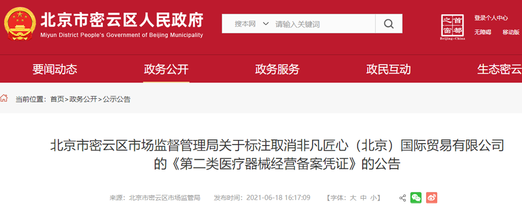 北京市密云區市場監督管理局關于標注取消非凡匠心(北京)國際貿易有限公司的《第二類醫療器械經營備案憑證》的公告