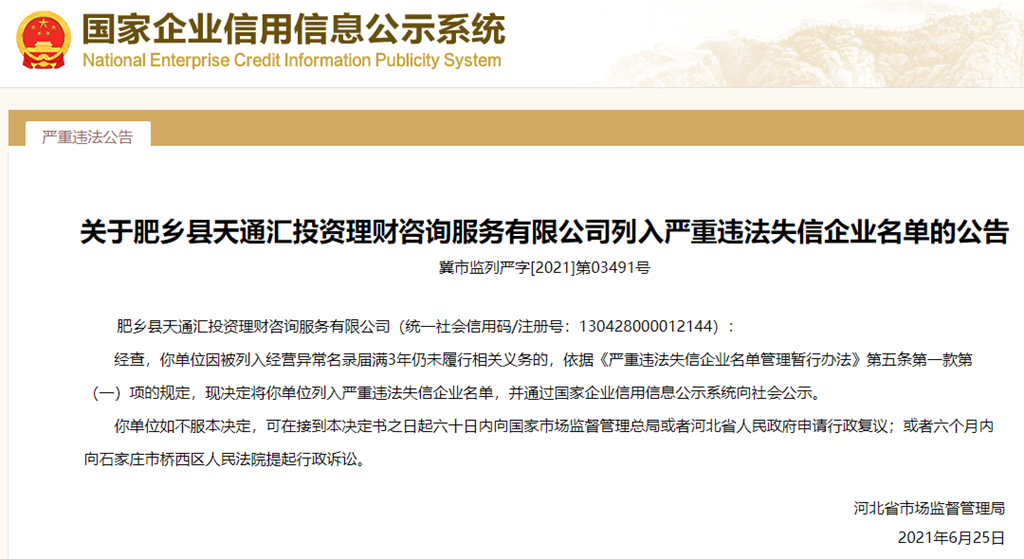 中國質(zhì)量新聞網(wǎng)訊 從國家企業(yè)信用信息公示系統(tǒng)獲悉,2021年6月25日,河北省市場監(jiān)督管理局發(fā)布關(guān)于肥鄉(xiāng)縣天通匯投資理財(cái)咨詢服務(wù)有限公司列入嚴(yán)重違法失信企業(yè)名單的公告(冀市監(jiān)列嚴(yán)字[2021]第03491號(hào))。