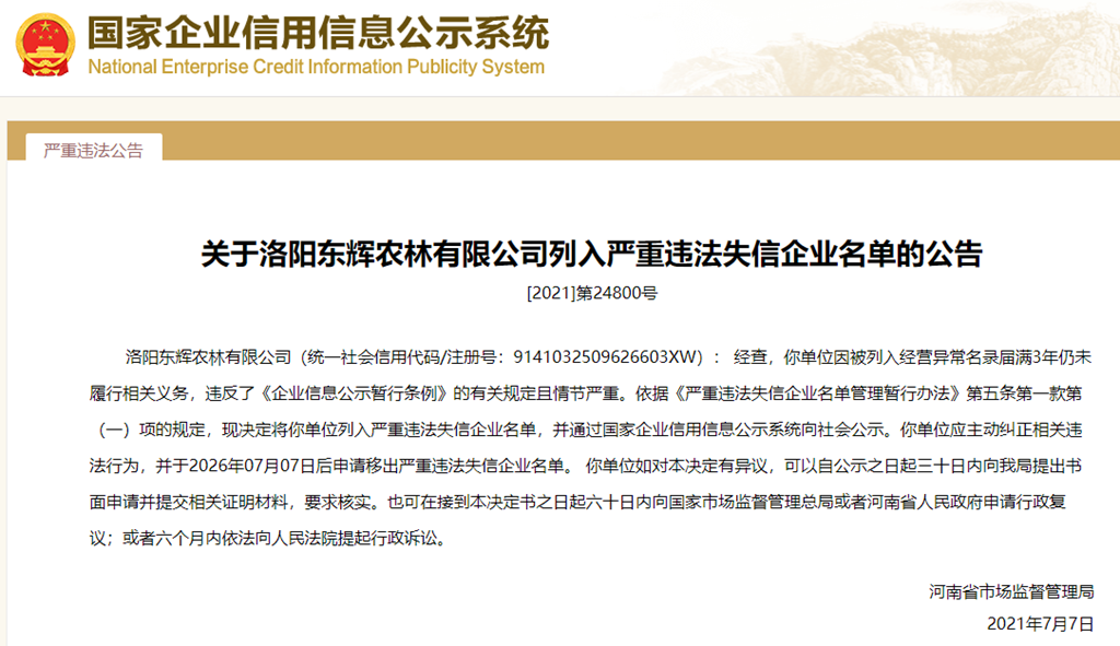 中國質量新聞網訊 從國家企業信用信息公示系統獲悉,2021年7月7日,河南省市場監督管理局發布關于洛陽東輝農林有限公司列入嚴重違法失信企業名單公告([2021]第24800號)。