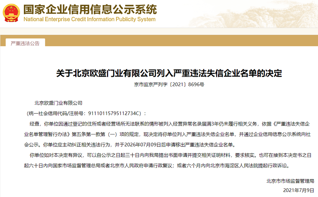 中國質量新聞網訊 從國家企業信用信息公示系統獲悉,2021年7月9日,北京市市場監督管理局發布關于北京歐盛門業有限公司列入嚴重違法失信企業名單的決定(京市監京嚴列字〔2021〕8696號)。