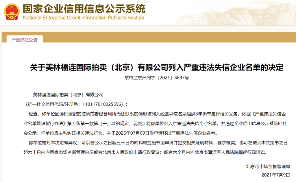 中國質(zhì)量新聞網(wǎng)訊 從國家企業(yè)信用信息公示系統(tǒng)獲悉,2021年7月9日,北京市市場監(jiān)督管理局發(fā)布關(guān)于美林福連國際拍賣(北京)有限公司列入嚴(yán)重違法失信企業(yè)名單的決定(京市監(jiān)京嚴(yán)列字〔2021〕8697號)。