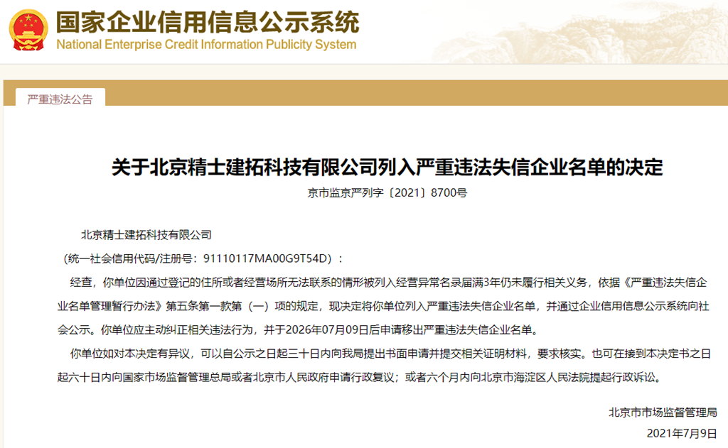 中國質(zhì)量新聞網(wǎng)訊 從國家企業(yè)信用信息公示系統(tǒng)獲悉,2021年7月9日,北京市市場監(jiān)督管理局發(fā)布關(guān)于北京精士建拓科技有限公司列入嚴重違法失信企業(yè)名單的決定(京市監(jiān)京嚴列字〔2021〕8700號)。