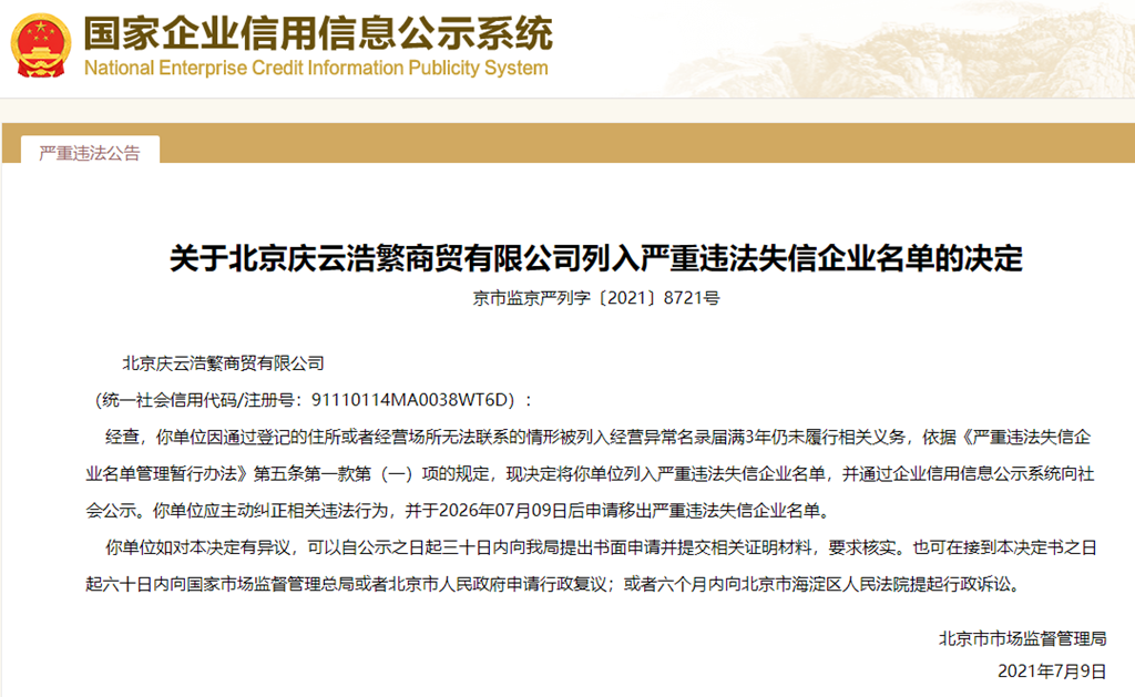 中國質量新聞網訊 從國家企業信用信息公示系統獲悉,2021年7月9日,北京市市場監督管理局發布關于北京慶云浩繁商貿有限公司列入嚴重違法失信企業名單的決定(京市監京嚴列字〔2021〕8721號)。