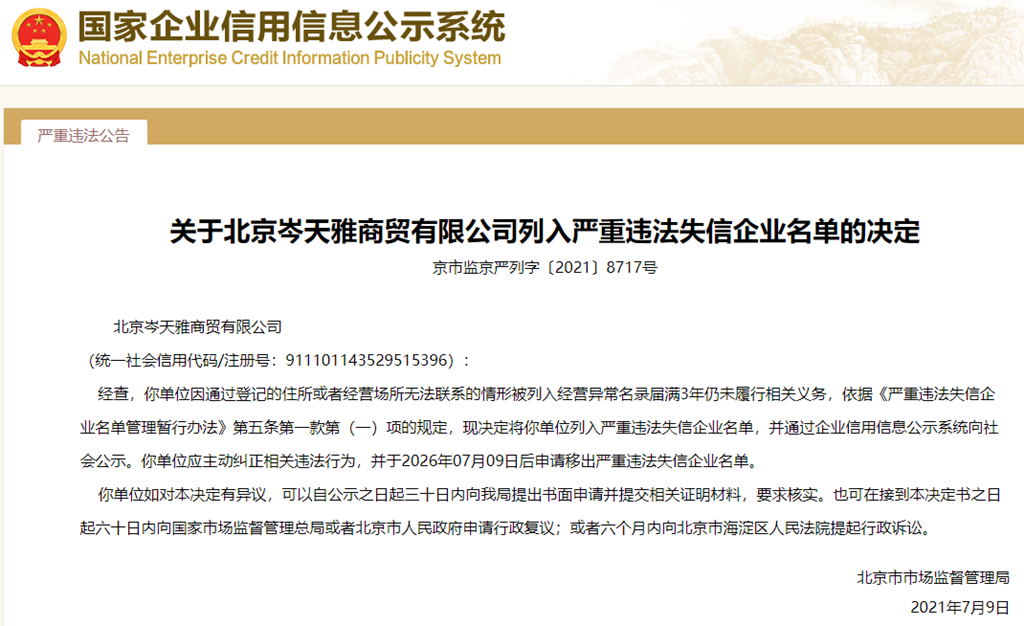 中國質量新聞網訊 從國家企業信用信息公示系統獲悉,2021年7月9日,北京市市場監督管理局發布關于北京岑天雅商貿有限公司列入嚴重違法失信企業名單的決定(京市監京嚴列字〔2021〕8717號)。