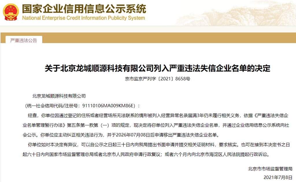 中國質量新聞網訊 從國家企業信用信息公示系統獲悉,2021年7月8日,北京市市場監督管理局發布關于北京龍城順源科技有限公司列入嚴重違法失信企業名單的決定(京市監京嚴列字〔2021〕8658號)。