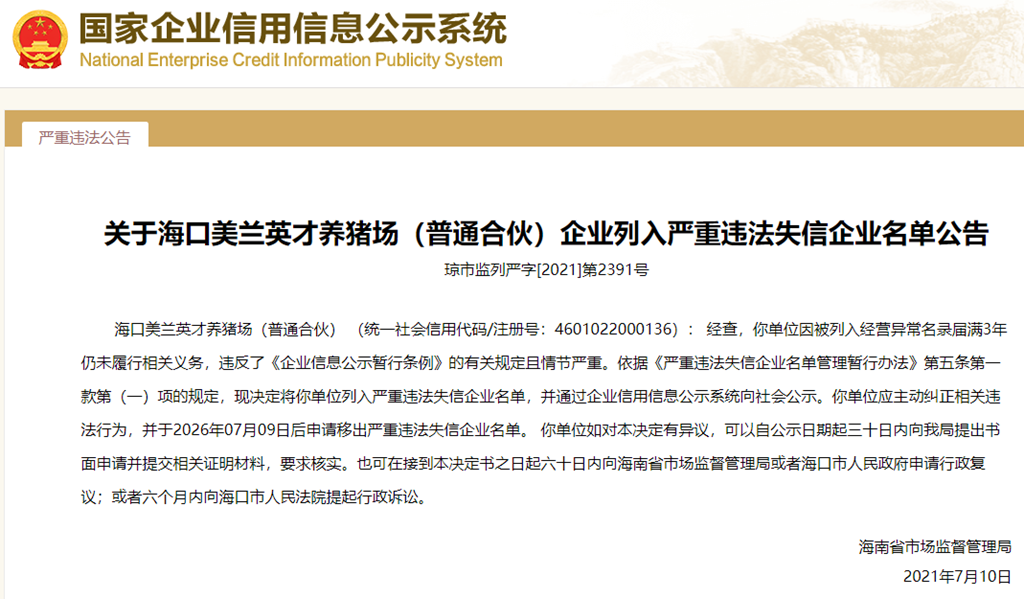 中國質量新聞網訊 從國家企業信用信息公示系統獲悉,2021年7月10日,海南省市場監督管理局發布關于海口美蘭英才養豬場(普通合伙)列入嚴重違法失信企業名單公告(瓊市監列嚴字[2021]第2391號)。