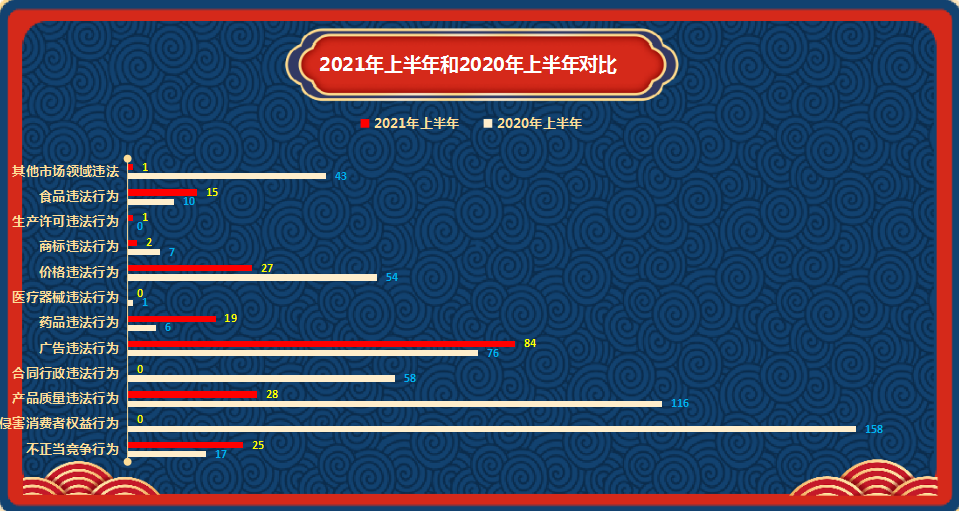 2021年上半年,全市市場監管系統共受理舉報件202件,比上年同期減少了63%。其中廣告違法行為84件,產品質量違法行為28件,價格違法行為27件,不正當競爭行為25件,藥品違法行為19件,食品違法行為15件,商標違法行為2件,生產許可違法行為1件,其他市場領域違法行為1件。(詳見圖四)