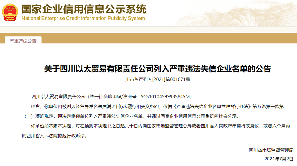 中國質量新聞網訊 從國家企業信用信息公示系統獲悉,2021年7月2日,四川省市場監督管理局發布關于四川以太貿易有限責任公司列入嚴重違法失信企業名單的公告(川市監嚴列入[2021]第001071號)。