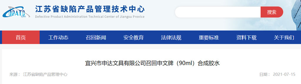 宜興市申達(dá)文具有限公司召回“申文”牌(90ml)合成膠水