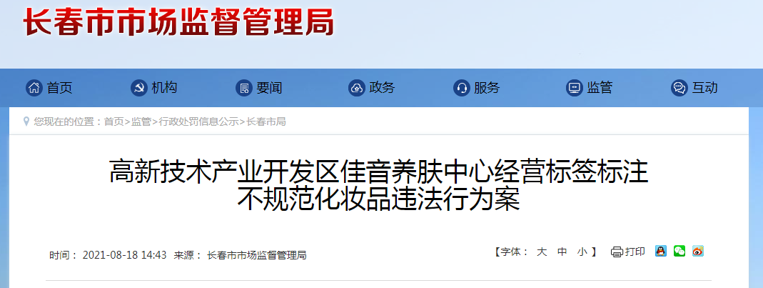 中國質量新聞網訊 8月18日,長春市市場監督管理局網站發布行政處罰決定書(長市監新行處字〔2021〕28號),涉及高新技術產業開發區佳音養膚中心經營標簽標注不規范化妝品違法行為案。