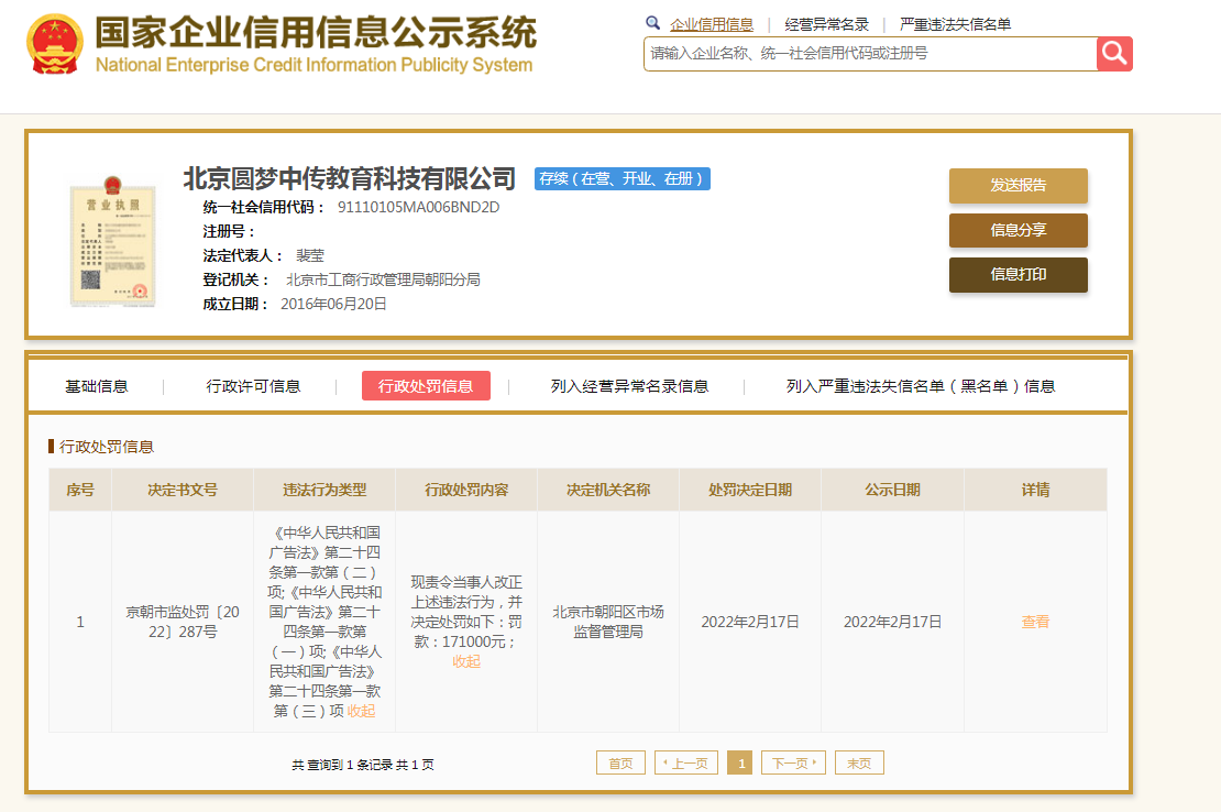 中國質量新聞網訊(閆冬)據國家企業信用信息公示系統顯示,近日,藝考培訓機構北京圓夢中傳教育科技有限公司(以下簡稱:圓夢中傳)因違反廣告法被市場監管部門罰款17萬余元。