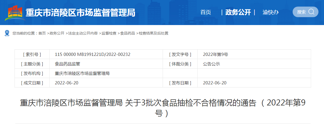 中國(guó)質(zhì)量新聞網(wǎng)訊 2022年6月20日,重慶市涪陵區(qū)市場(chǎng)監(jiān)督管理局網(wǎng)站發(fā)布2022年第9號(hào)食品抽檢信息。本次檢出1批次高粱酒不合格。