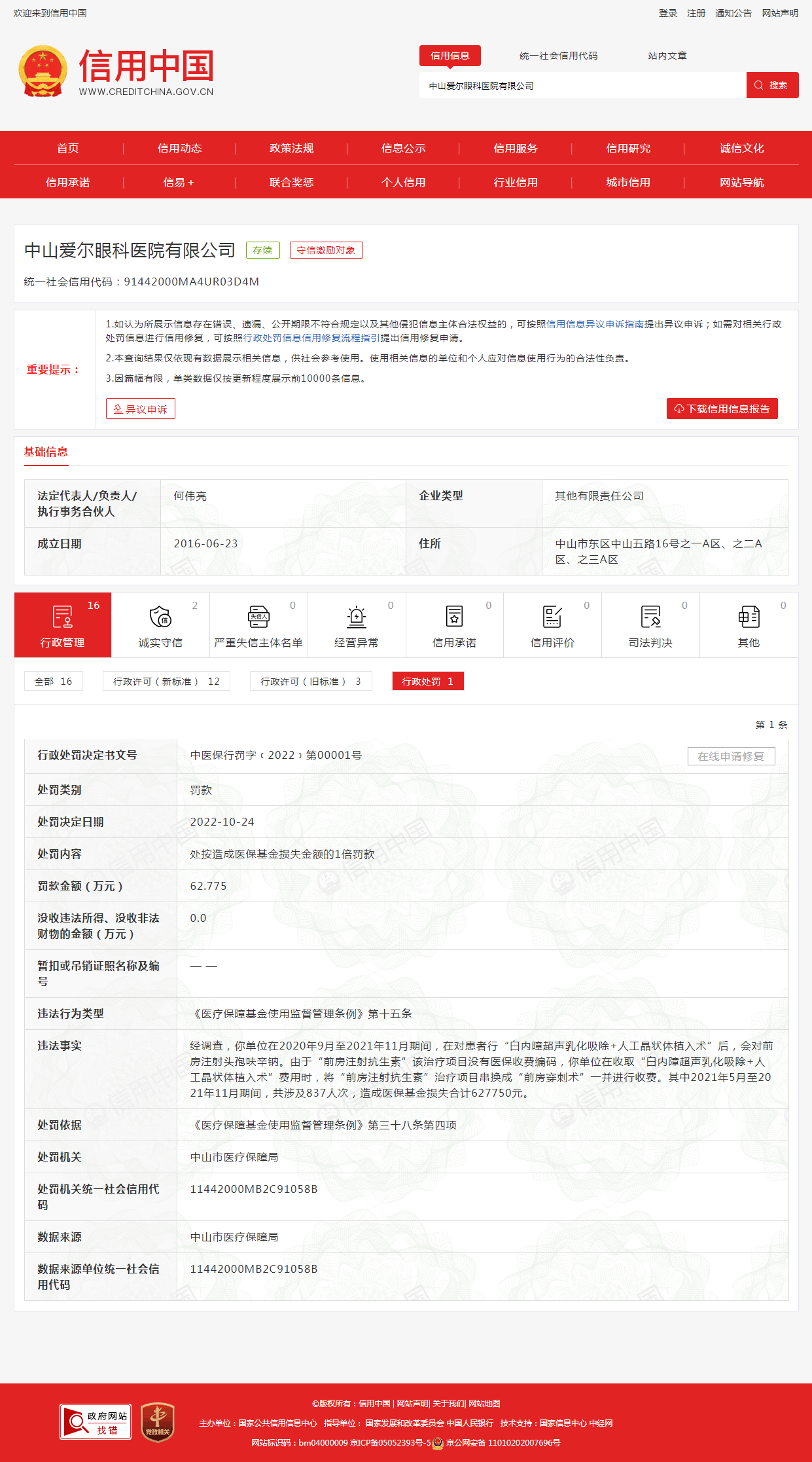 中國質量新聞網訊 近日,信用中國發布的一則行政處罰信息顯示,中山愛爾眼科醫院有限公司造成醫保基金損失,被罰款62.775萬元。