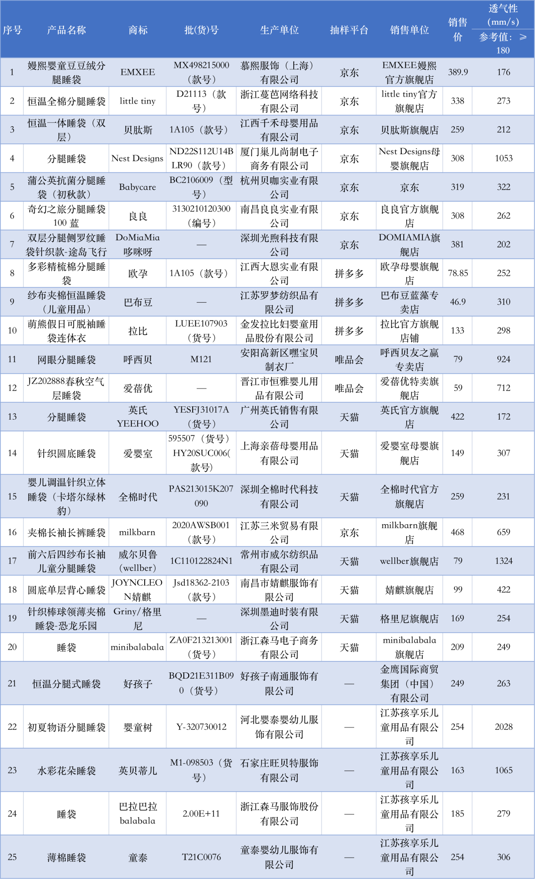 其中標稱廣州英氏銷售有限公司生產、天貓英氏官方旗艦店銷售、標稱品牌為英氏YEEHOO、售價422元的1款分腿睡袋(貨號:YESFJ31017A),透氣率為172mm/s,不符合參考標準要求≥180mm/s。透氣性在25款樣品中處于最后一名。