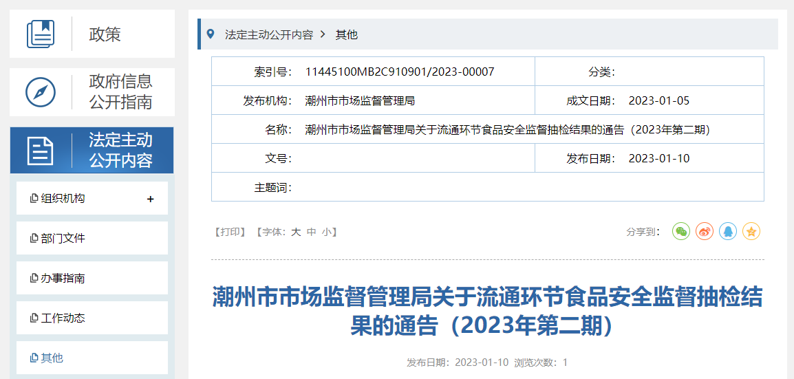 中國質量新聞網訊 2023年1月10日,廣東省潮州市市場監管局網站發布關于流通環節食品安全監督抽檢結果的通告(2023年第二期)。本期抽檢5批次糧食加工品,全部合格。