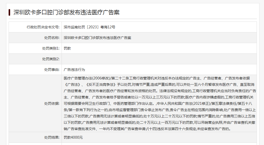 中國質(zhì)量新聞網(wǎng)訊(閆冬)近日,深圳市市場監(jiān)督管理局網(wǎng)站公開一則行政處罰決定書。深圳歐卡多口腔門診部因發(fā)布違法醫(yī)療廣告被市場監(jiān)管部門查處。