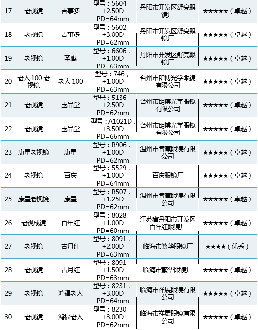 依據GB/T13511.3-2019配裝眼鏡 第3部分:單光老視成鏡,30組產品球鏡頂焦度項目測試中,檢測結果均達到國家強制標準要求,其中福特翼虎、圣鷹、名旺、夕陽紅、一百歲、吉事多、康星、百慶、古月紅、鴻福老人品牌的老花鏡均得滿分。