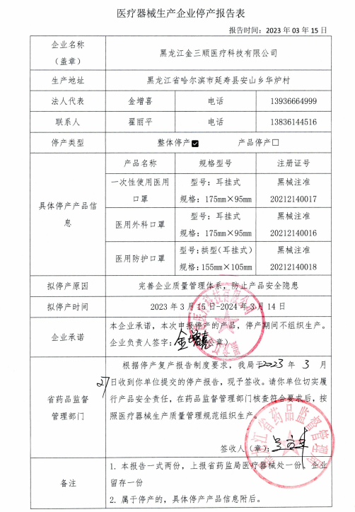 中國質量新聞網(wǎng)訊 3月27日,黑龍江省藥品監(jiān)督管理局網(wǎng)站發(fā)布醫(yī)療器械生產企業(yè)停產報告表(黑龍江金三順醫(yī)療科技有限公司)。