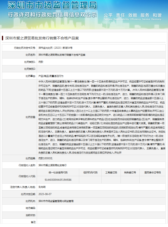 中國質量新聞網訊 近日,深圳市市場監督管理局光明監管局發布行政處罰信息(深市監光處罰〔2023〕新湖54號),涉及深圳市愛之源貿易批發商行銷售不合格產品案。