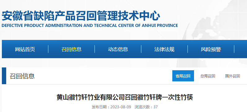 中國質量新聞網訊 據安徽省缺陷產品召回管理技術中心網站8月9日消息,日前,黃山徽竹軒竹業有限公司按照《消費品召回管理暫行規定》的要求,主動向安徽省市場監督管理局、黃山市市場監督管理局報告了召回計劃,將自即日起,召回2023年6月10日制造的(部分)徽竹軒牌一次性竹筷,涉及數量為10000袋。