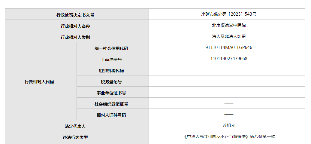 天眼查信息顯示,北京悟德堂中醫院成立于2019年7月,出資額為100萬人民幣,投資人為蘇旭光。經營范圍包括醫療服務;組織文化藝術交流活動(不含演出);軟件開發;基礎軟件服務;市場調查;經濟貿易咨詢;企業管理咨詢;公共關系服務;設計、制作、代理、發布廣告;承辦展覽展示活動;會議服務;醫學研究和試驗發展;技術開發、技術咨詢、技術交流、技術轉讓、技術推廣、技術服務;健康咨詢、健康管理(須經審批的診療活動除外);貨物進出口、代理進出口、技術進出口;銷售醫療器械(不含三類)、日用品、化妝品、衛生用品、化工產品(不含危險化學品)、文化用品、花卉。在2019年8月14日,該中醫院曾因“通過登記的住所或者經營場所無法聯系的”被列入經營異常名錄,直到近5個月后的2020年1月6日被移出。