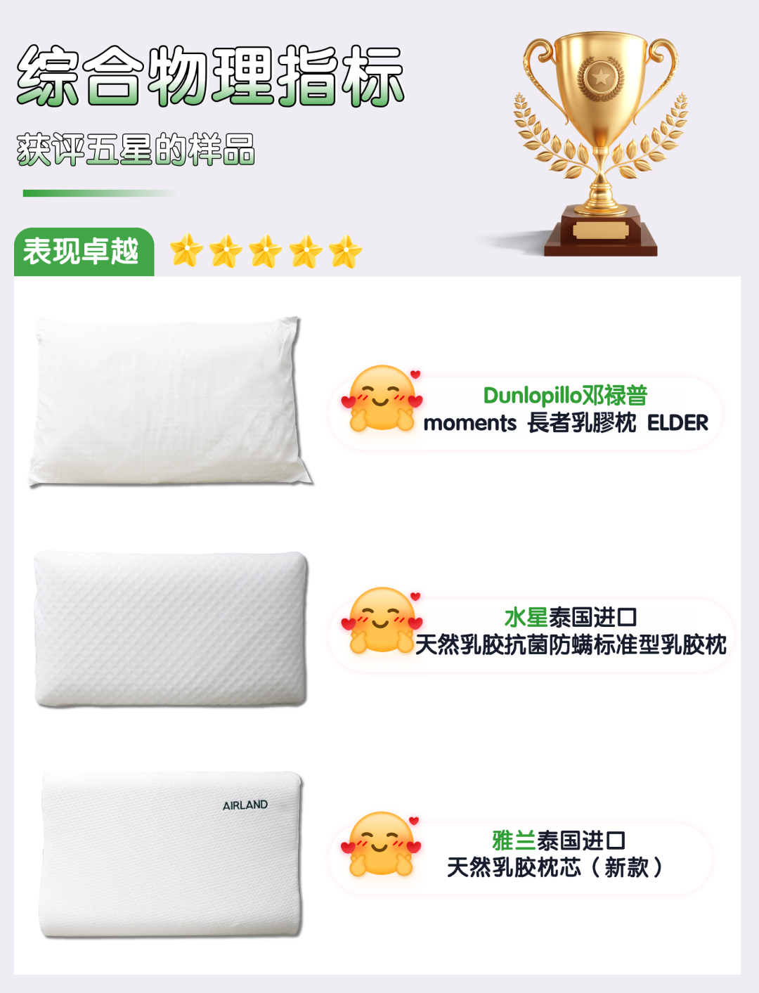 本次比較試驗測試的20款樣品中,有5款樣品的綜合表現卓越,獲評五星,它們是:百富帝、JSY LATEX、睡眠博士、全棉時代、水星品牌樣品。