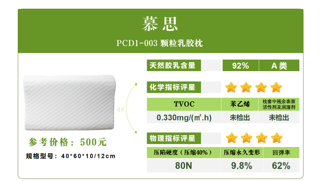 20款樣品的檢測結果均符合相關標準要求,其中水星、雅蘭、Dunlopillo(鄧祿普)等3款品牌樣品表現卓越,在該項獲評五星。