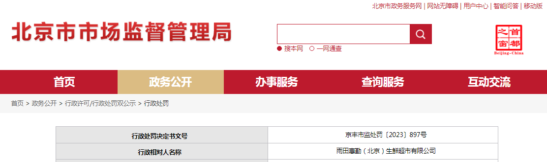 中國質量新聞網訊 近日,北京市豐臺區市場監督管理局對雨田惠勤(北京)生鮮超市有限公司作出行政處罰。行政處罰決定書文號:京豐市監處罰〔2023〕897號。