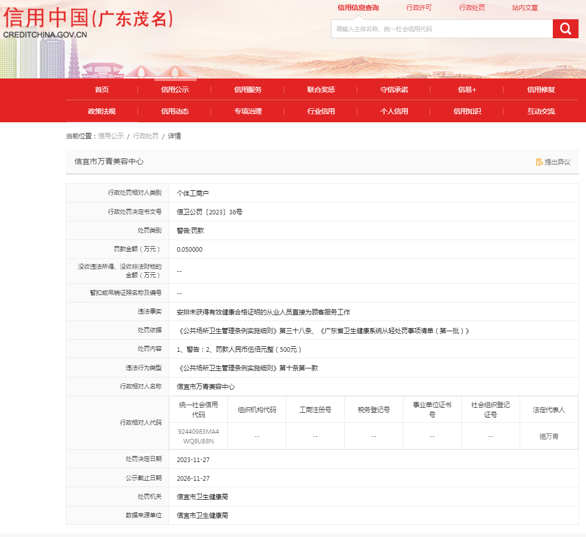 信宜市萬青美容中心安排未獲得有效健康合格證明的從業人員直接為顧客服務工作案