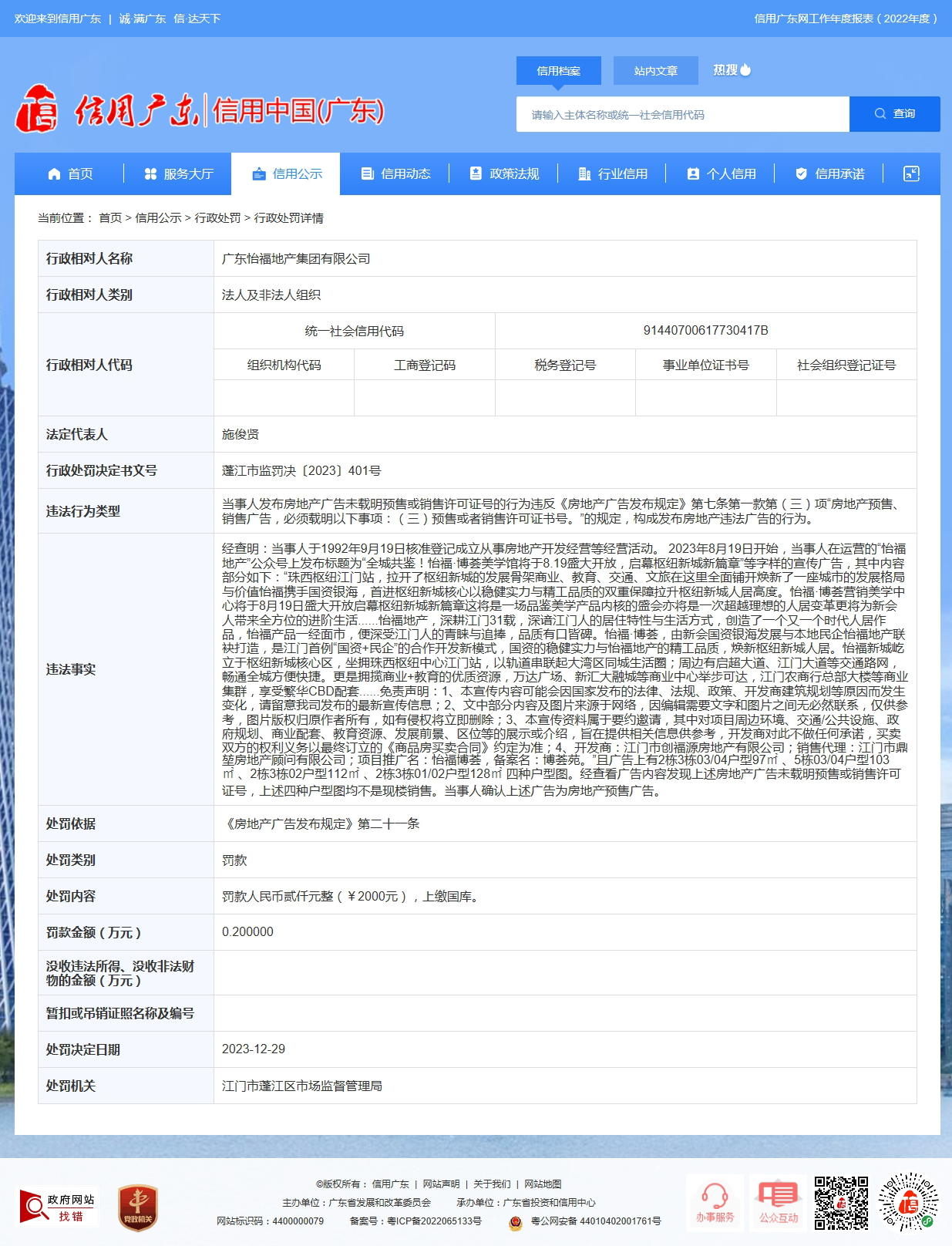廣東省江門市蓬江區市場監督管理局對廣東怡福地產集團有限公司作出行政處罰