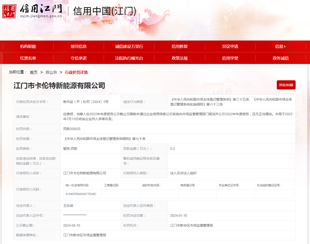江門市卡倫特新能源有限公司未按規定報送年度報告案