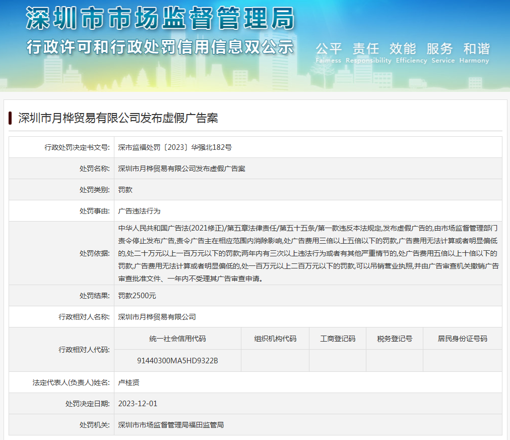 深圳市月樺貿易有限公司發布虛假廣告案