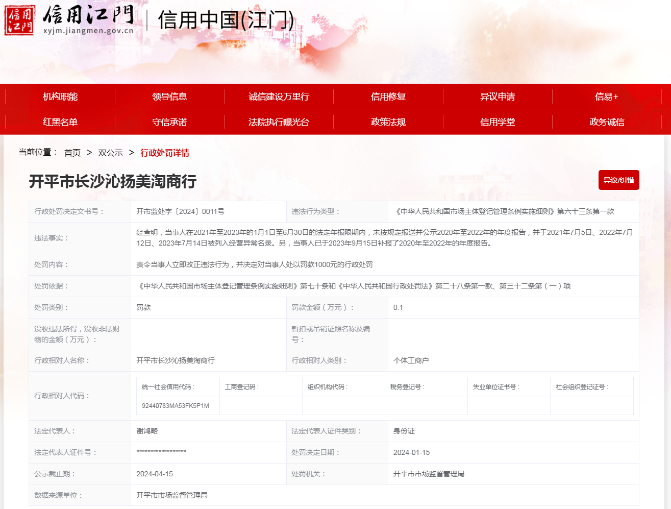 【廣東】開平市長沙沁揚美淘商行未按規定報送年度報告案