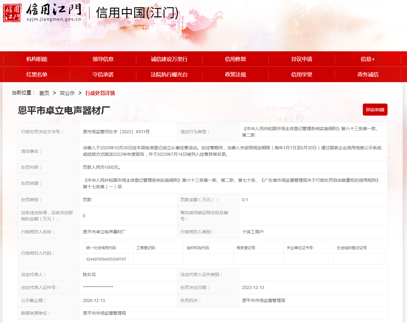 【廣東】恩平市卓立電聲器材廠未按規定報送年度報告案