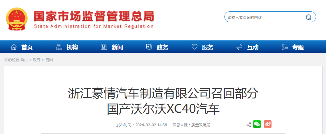 日前,浙江豪情汽車(chē)制造有限公司根據(jù)《缺陷汽車(chē)產(chǎn)品召回管理?xiàng)l例》和《缺陷汽車(chē)產(chǎn)品召回管理?xiàng)l例實(shí)施辦法》的要求,向國(guó)家市場(chǎng)監(jiān)督管理總局備案了召回計(jì)劃。自即日起,召回2023年3月10日至2023年12月20日生產(chǎn)的部分國(guó)產(chǎn)2024年款XC40汽車(chē),共計(jì)6608輛。