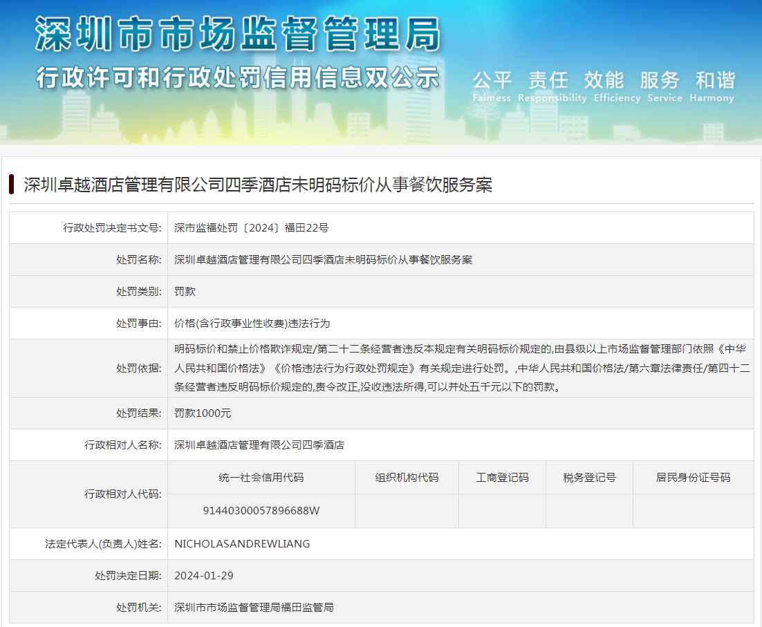 深圳卓越酒店管理有限公司四季酒店未明碼標價從事餐飲服務案