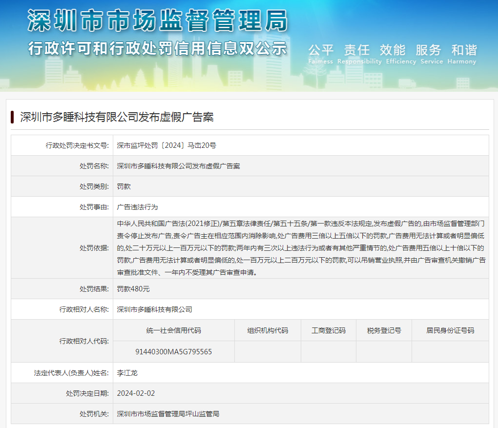 深圳市多睡科技有限公司發(fā)布虛假廣告案