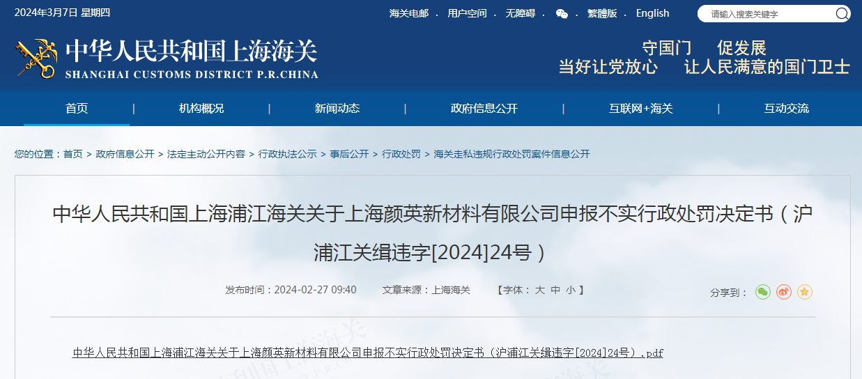 中華人民共和國上海浦江海關關于上海顏英新材料有限公司申報不實行政處罰決定書(滬浦江關緝違字[2024]24號)