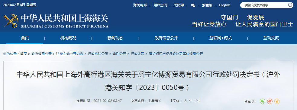 中華人民共和國上海外高橋港區海關關于濟寧億博源貿易有限公司行政處罰決定書(滬外港關知字〔2023〕0050號)