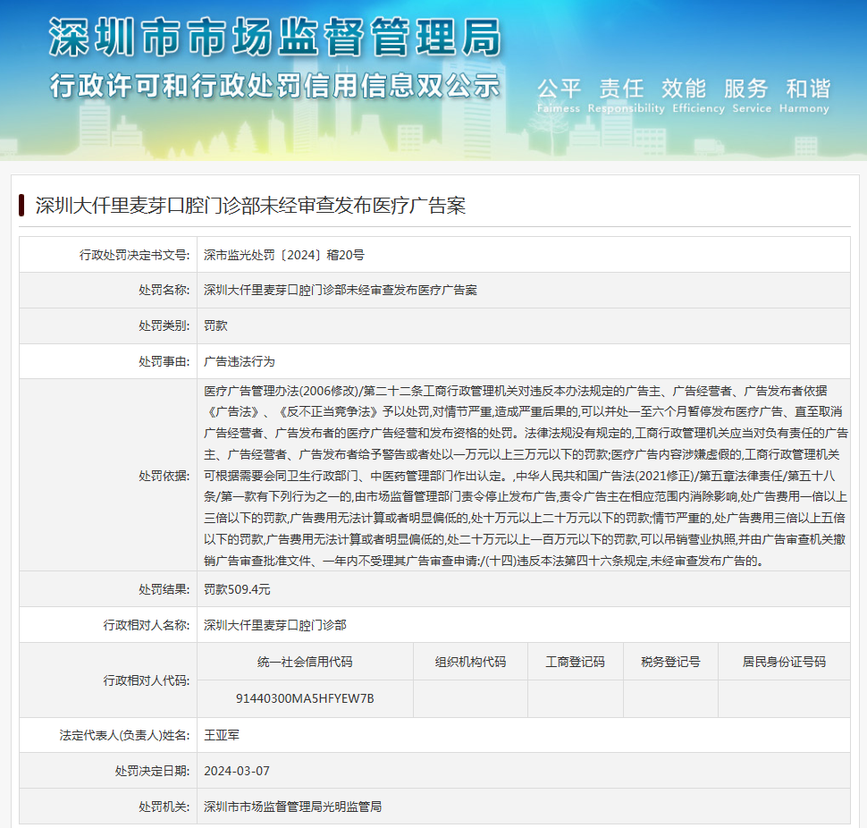 深圳大仟里麥芽口腔門診部未經審查發布醫療廣告案