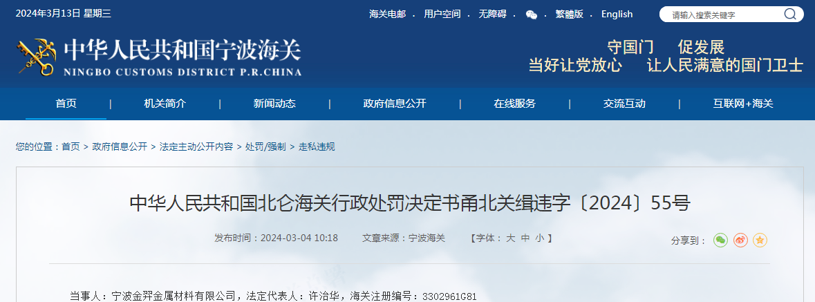 中華人民共和國北侖海關行政處罰決定書甬北關緝違字〔2024〕55號