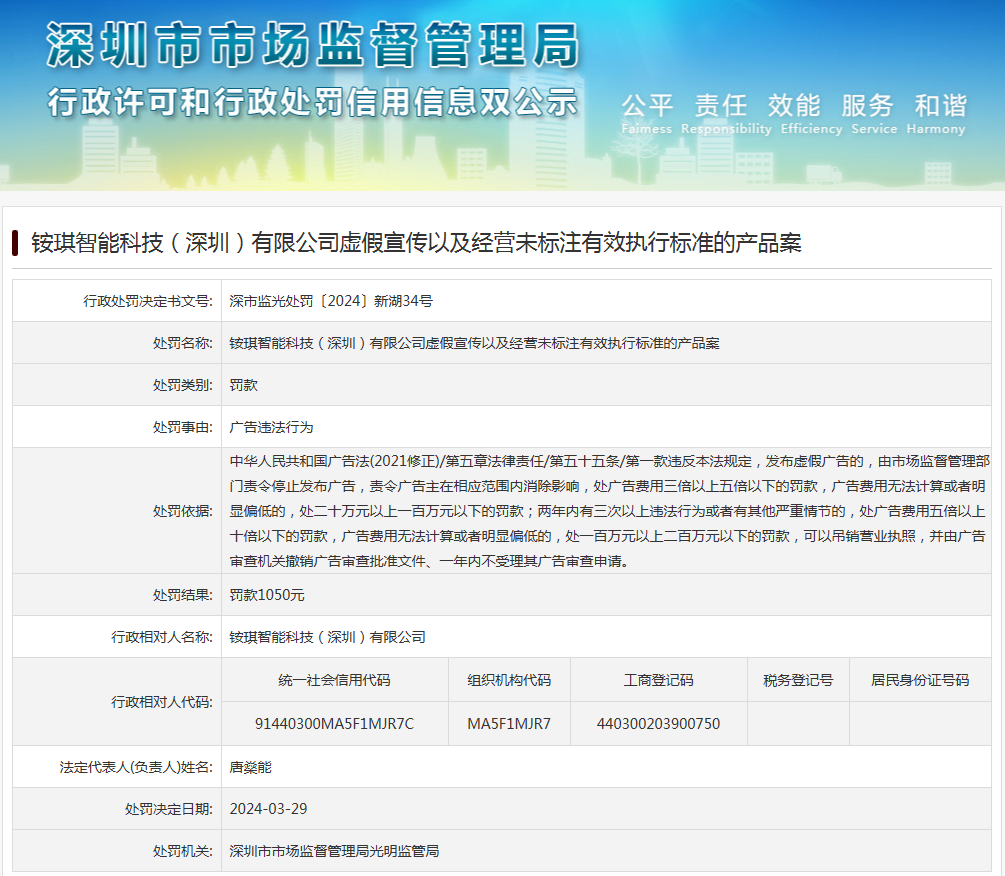 銨琪智能科技(深圳)有限公司虛假宣傳以及經(jīng)營(yíng)未標(biāo)注有效執(zhí)行標(biāo)準(zhǔn)的產(chǎn)品案