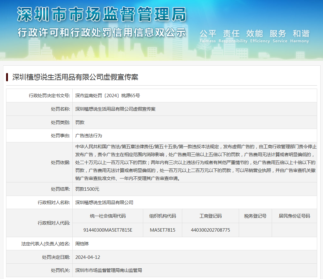 深圳植想說生活用品有限公司虛假宣傳案