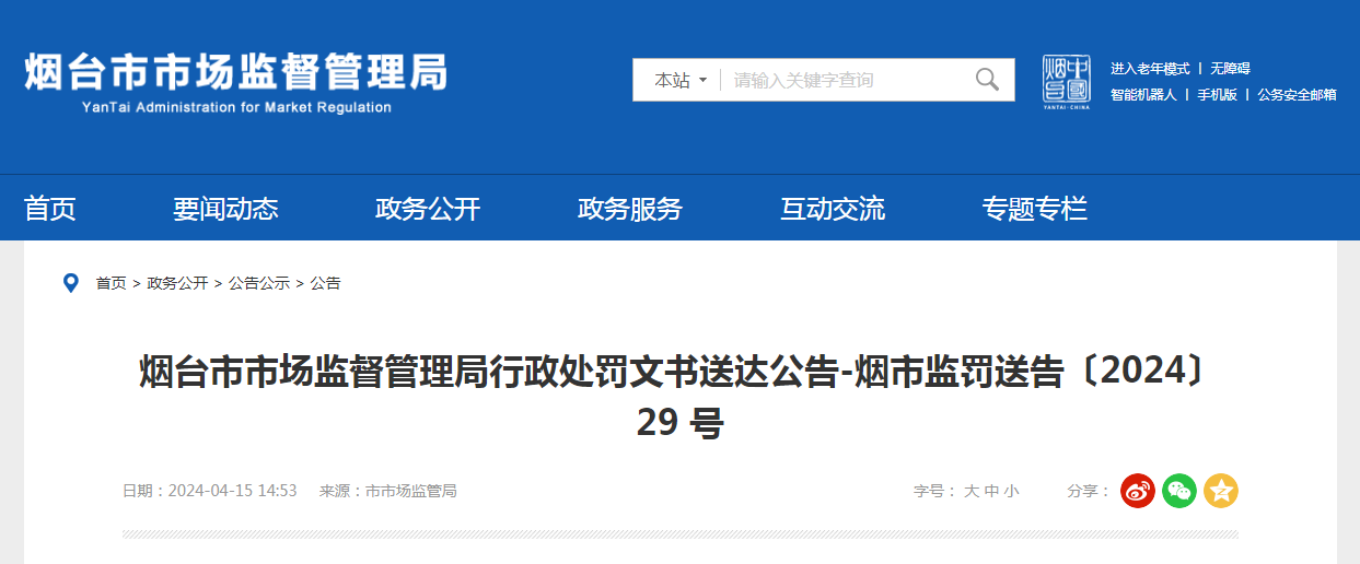 煙臺市市場監督管理局行政處罰文書送達公告-煙市監罰送告〔2024〕29號