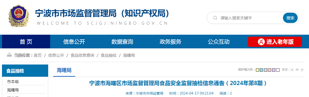寧波市海曙區市場監督管理局食品安全監督抽檢信息通告(2024年第8期)